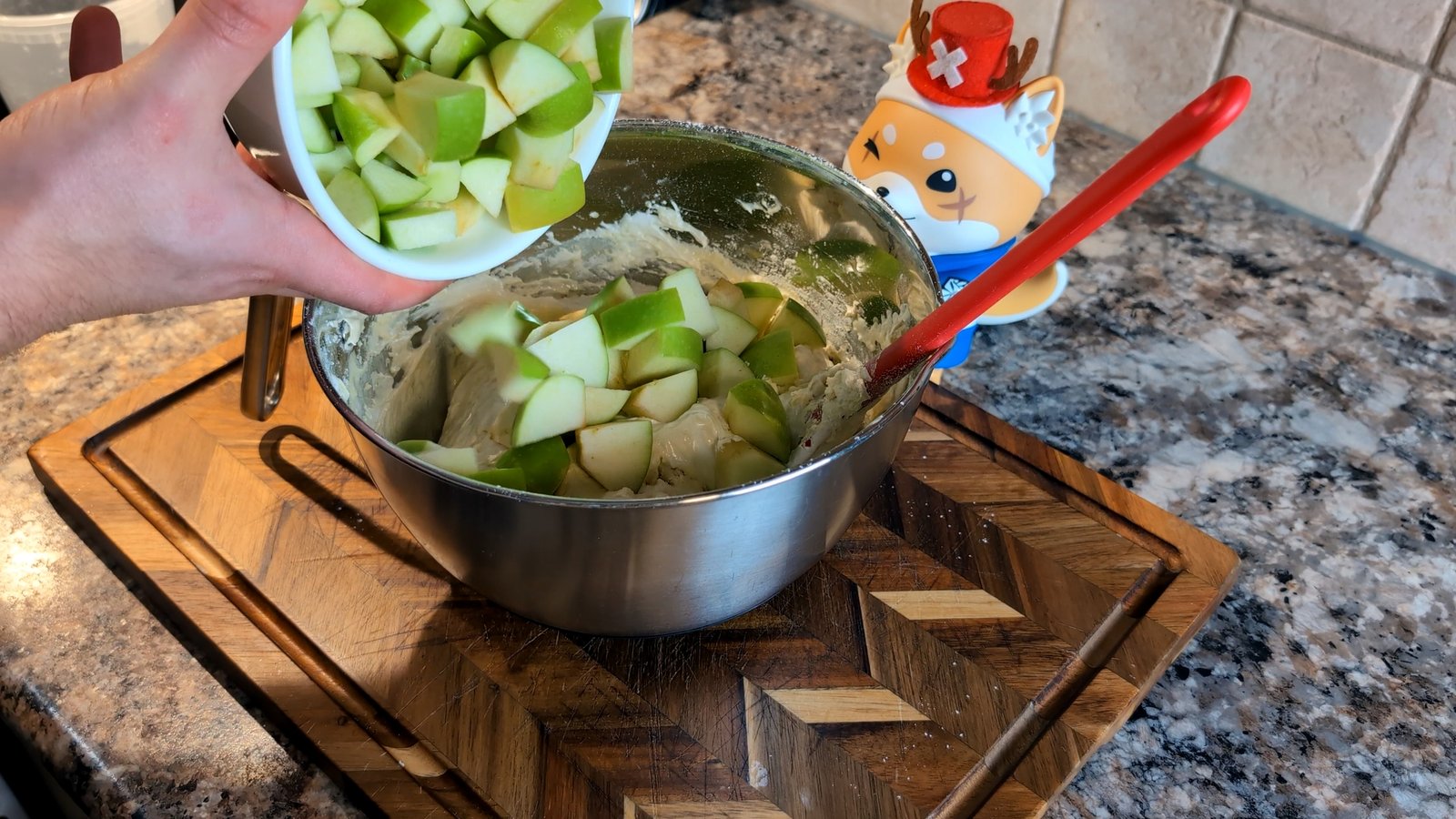 - Add the chopped 4 apples directly into the batter and fold gently to combine. Pour the mixture into your prepared baking pan.
