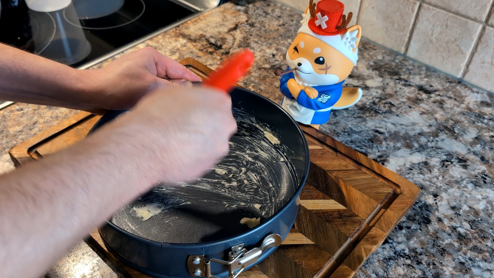 - Generously grease a round cake pan (a pan with a removable bottom is ideal) with 1 tbsp unsalted butter. The butter helps create a delicious, tasty crust! You can also line it with parchment paper first if your pan tends to stick.