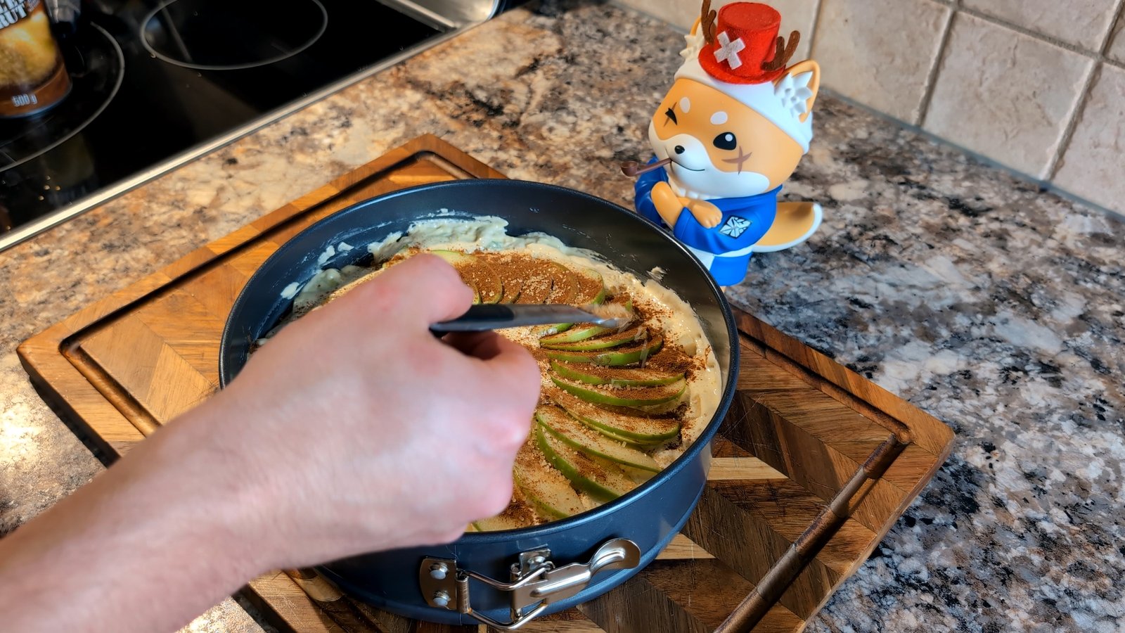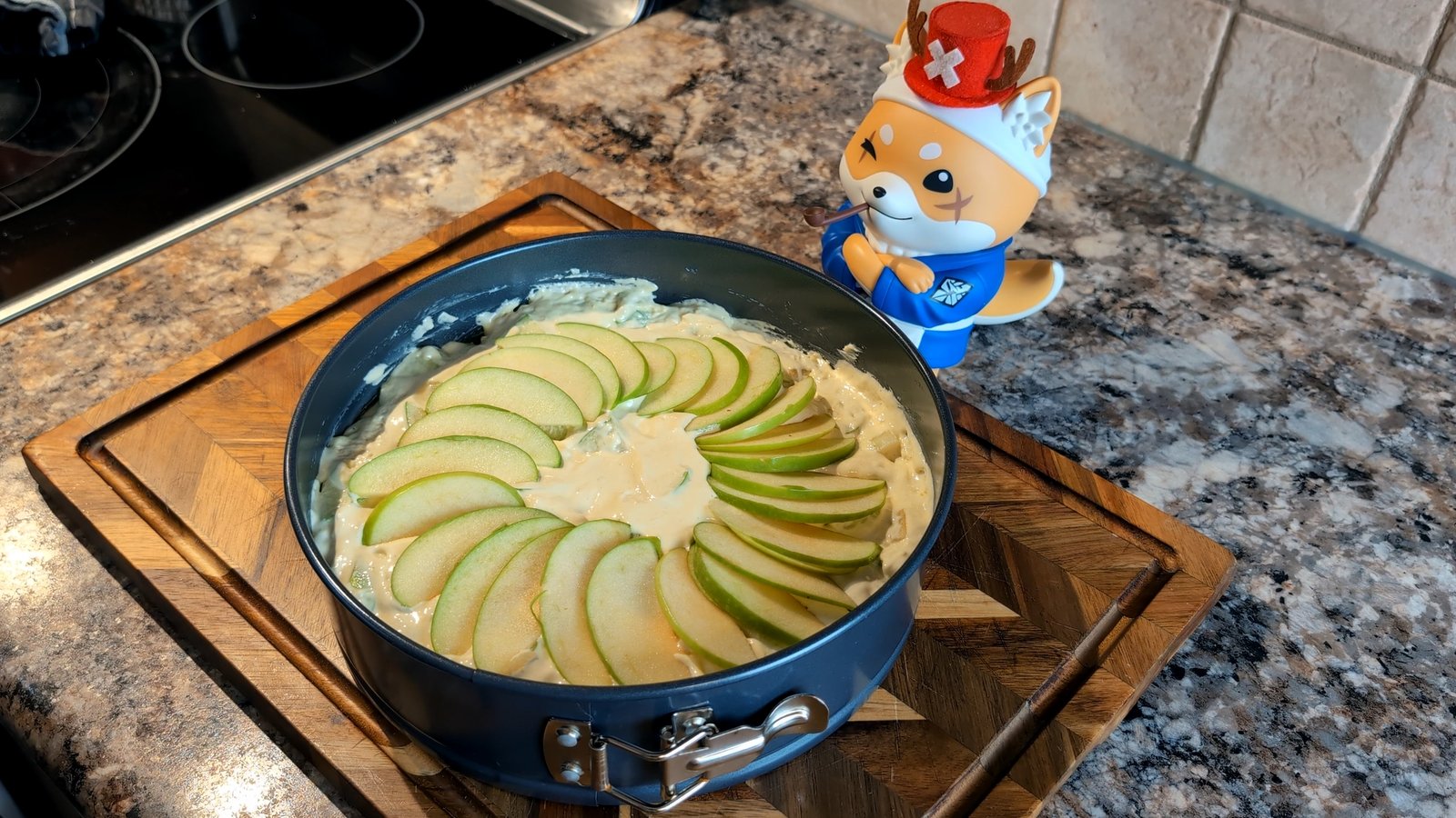 - Arrange the final apple, cut into thin crescents, on top of the batter in a circular "sun" pattern, starting from the outside and working your way in.