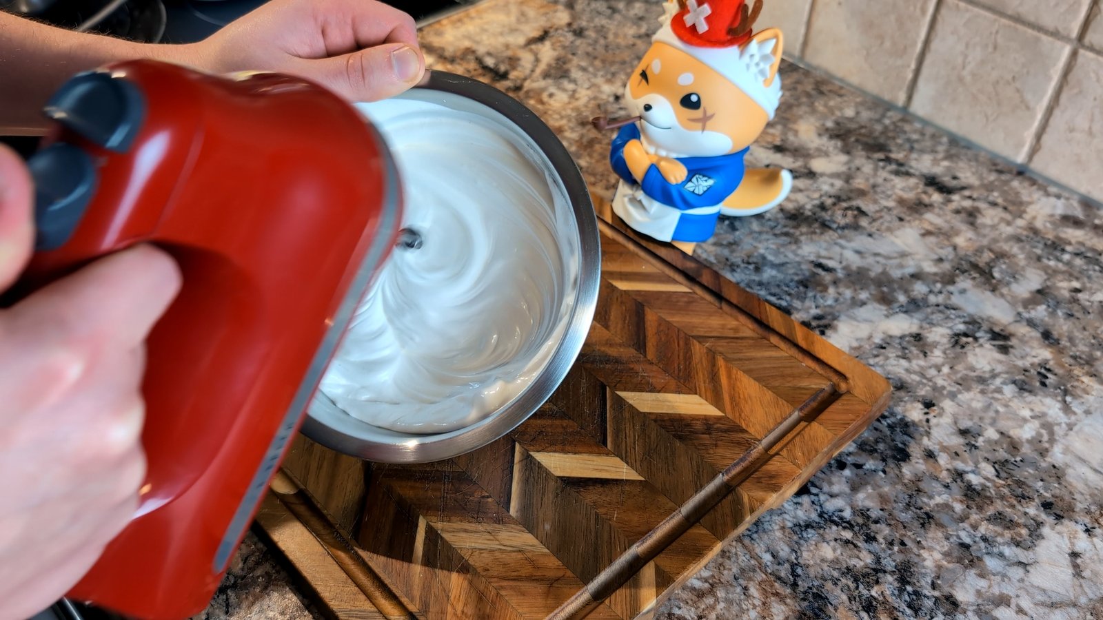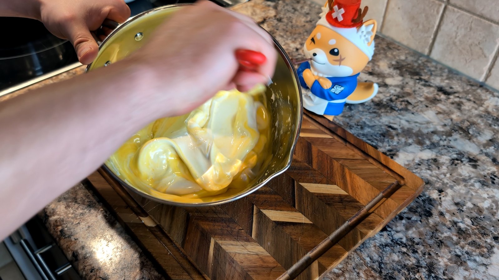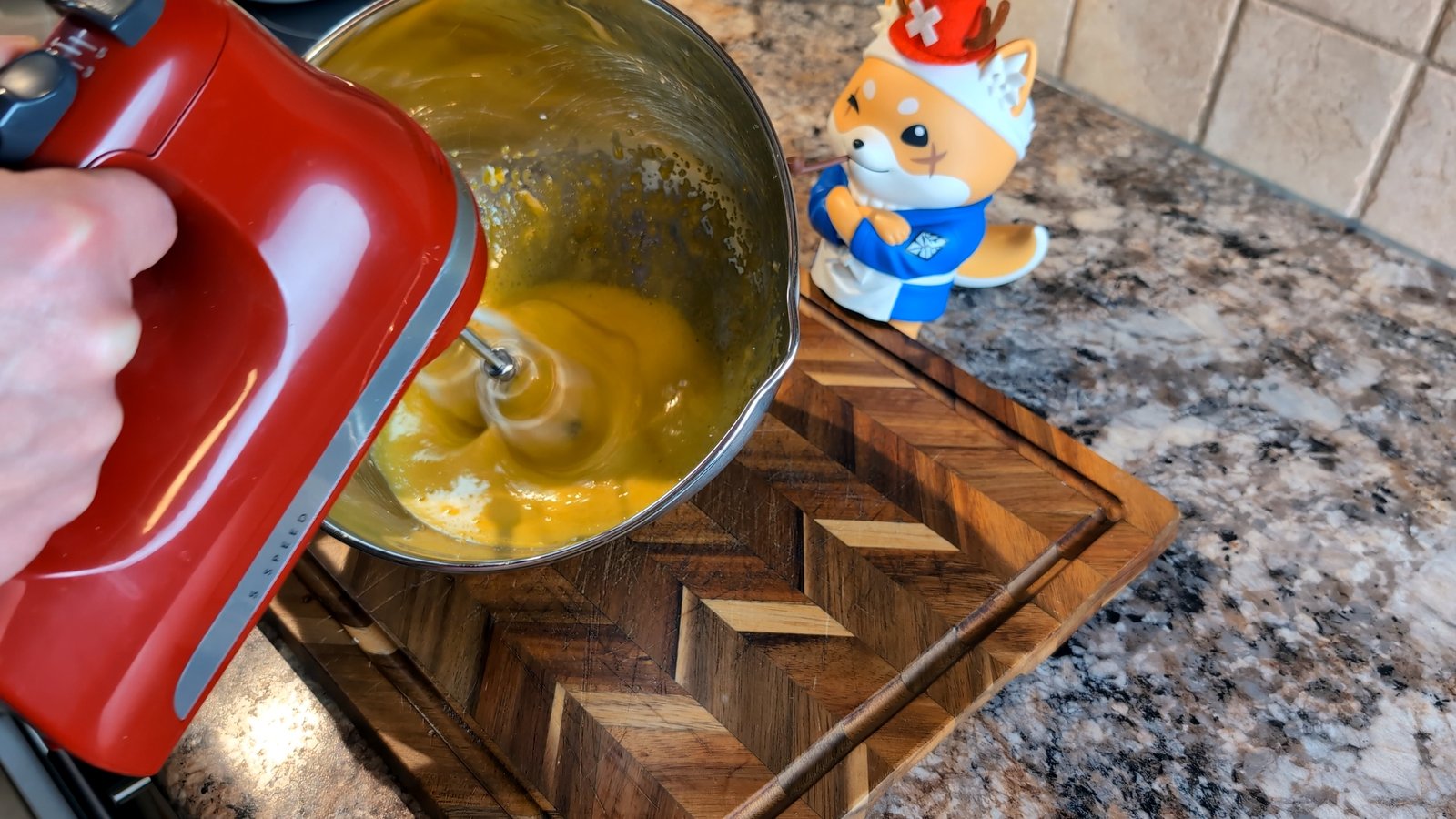 - Very gently fold the whipped egg whites into the yolk mixture.