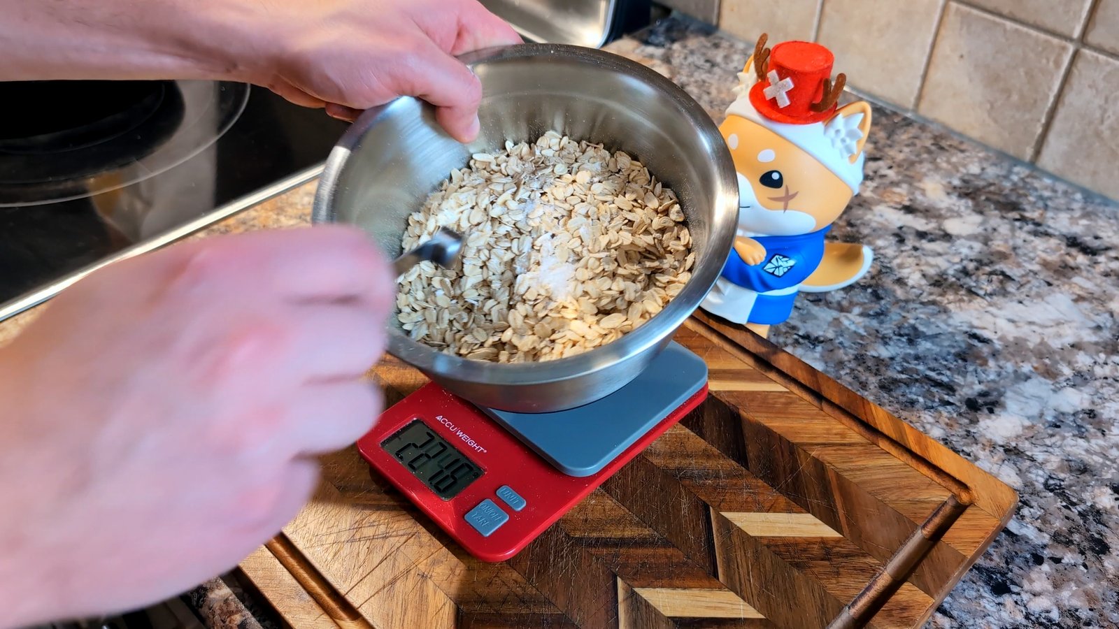 - In a mixing bowl, stir in the 250 g rolled oats and 1/4 tsp salt.