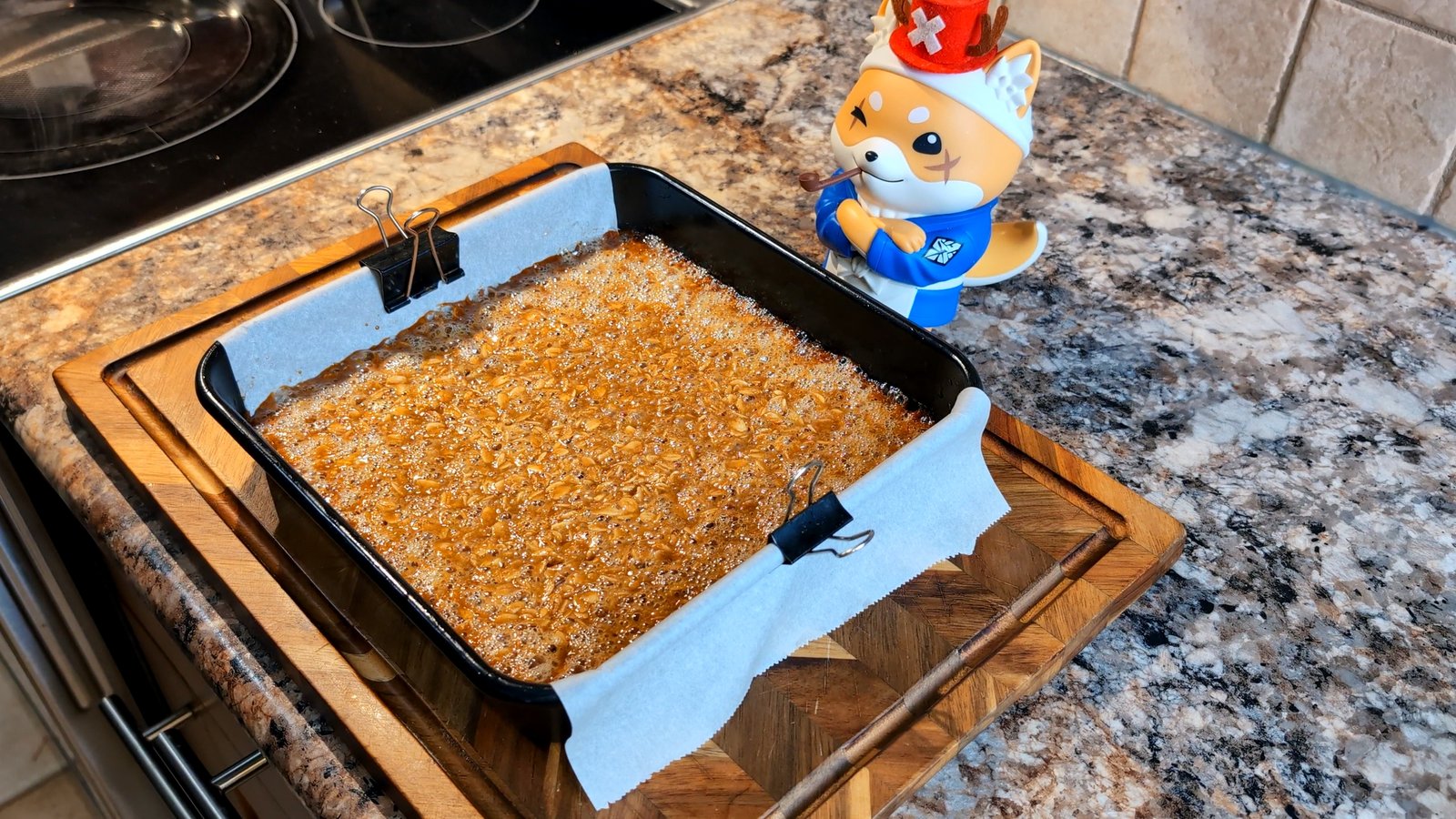 - In a medium sauce pan over low-medium heat, combine the 125 g unsalted butter, 125 g brown sugar, and 3 Tbsp honey.Chef's Tip : The Brits use golden syrup instead of honey for the traditional, authentic caramel flavor! However, I chose honey for this recipe because it is a wonderfully natural, less processed sweetener that is easier to find at the local grocery store, and it gives the flapjacks a delicious floral sweetness.