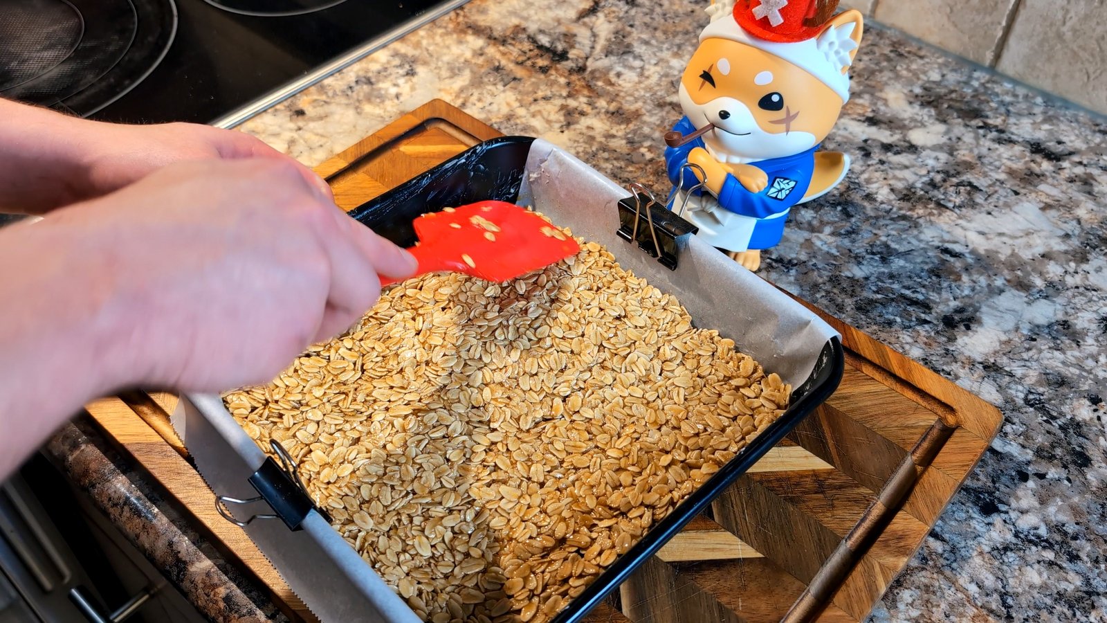 - Transfer the oat mixture into the prepared baking pan. Use the back of a spoon or spatula to press it down firmly and evenly into the corners.