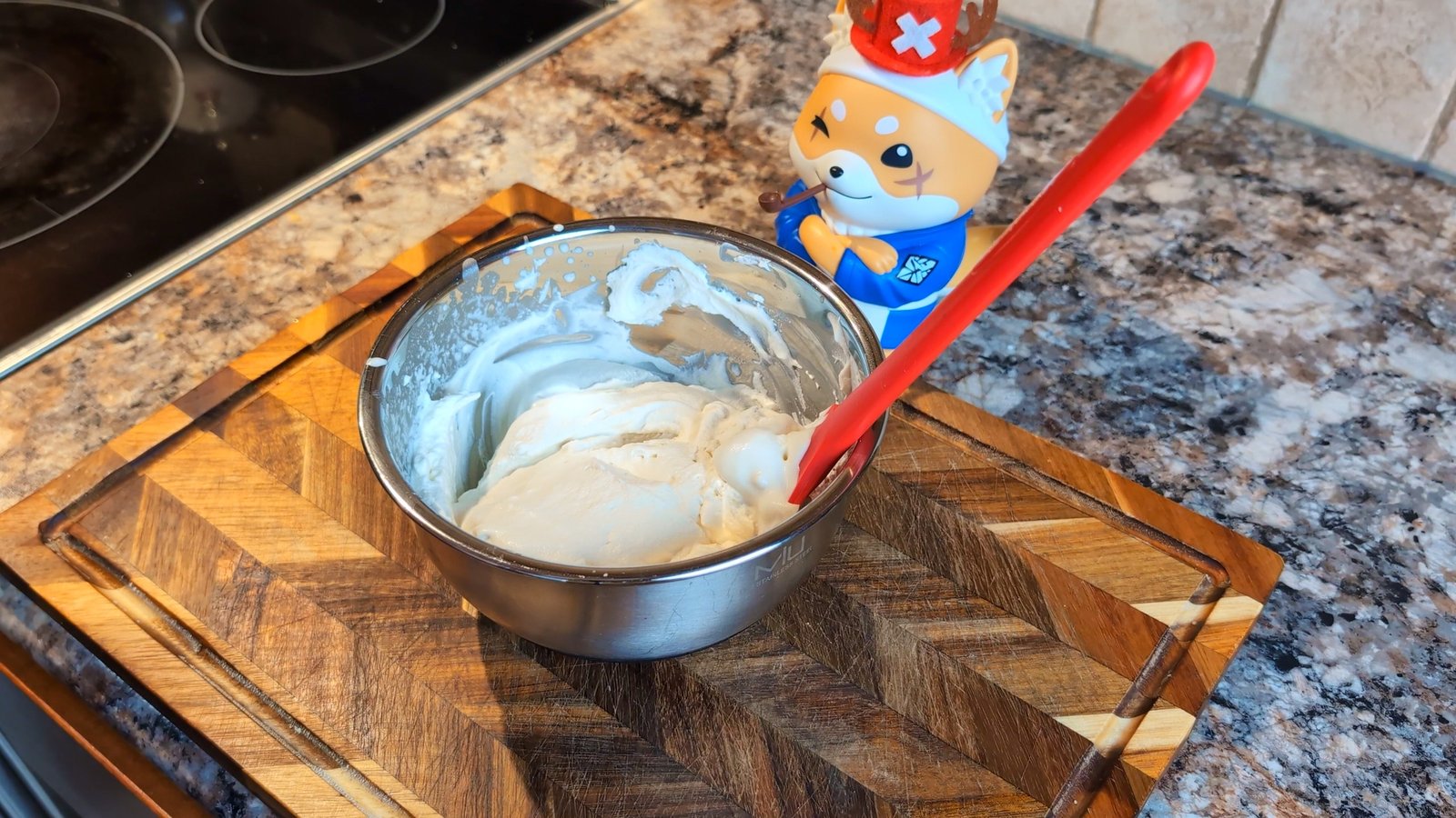 - In a mixing bowl, using a hand mixer, whisk the 250 ml heavy cream, 2 tsp. vanilla extract, 1/4 tsp. almond extract and 2 Tbsp. powdered sugar until soft peaks form.