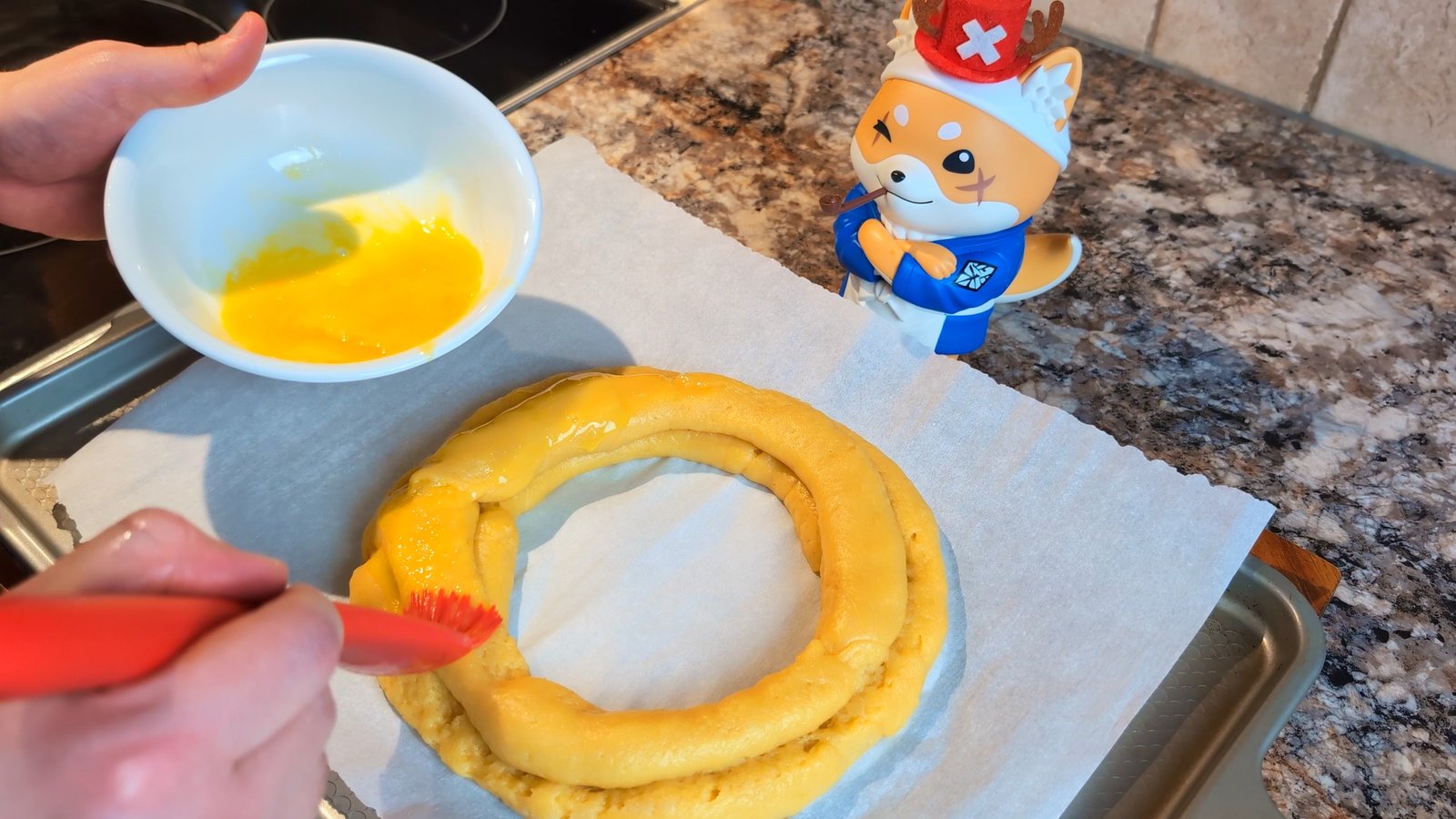 - Brush with the final beaten egg from the rest of the earlier eggs.