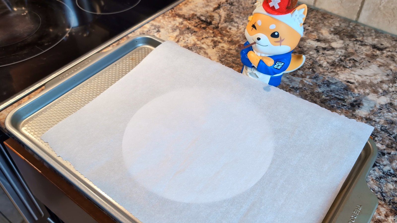 - Preheat the oven to 410°F (210°C). Line a baking tray with parchment paper. Draw an 18cm circle on the paper as a template, then flip it over so the ink/pencil doesn't touch the dough.