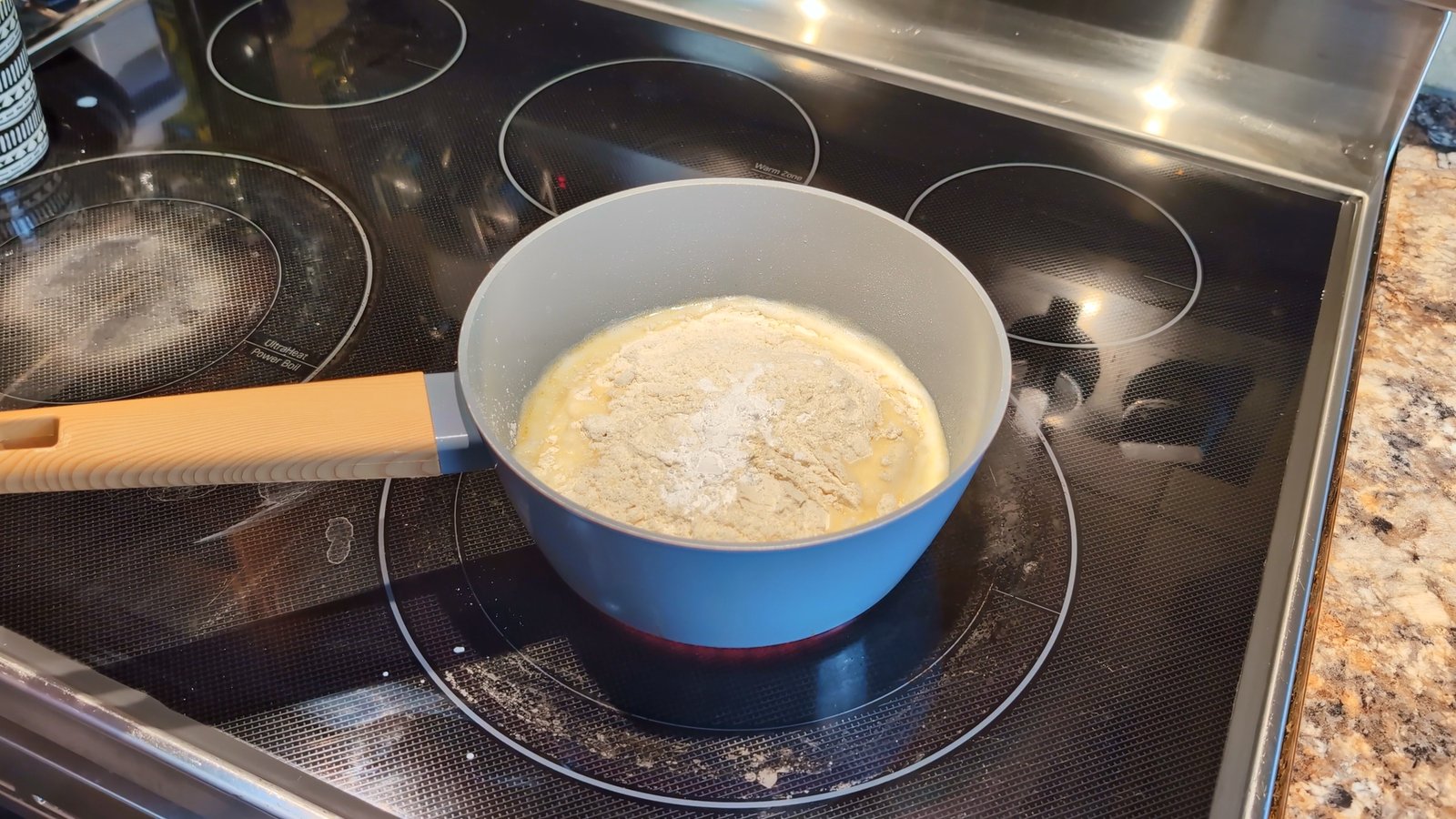 - Once the butter is melted and the mix starts to simmer, add the sifted 175 g all-purpose flour and 1 tsp. powdered sugar all at once.