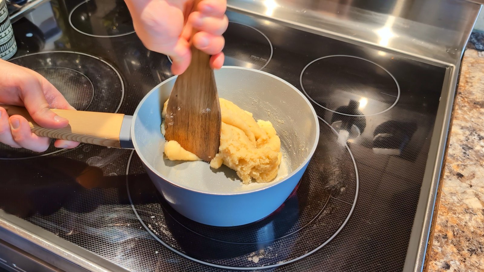 - Beat vigorously with a wooden spoon until the dough forms a ball and pulls away from the sides.Denis's Tip: Keep cooking and stirring for about 1-2 minutes after the ball forms to dry out the dough. This ensures a crispier shell that won't collapse!