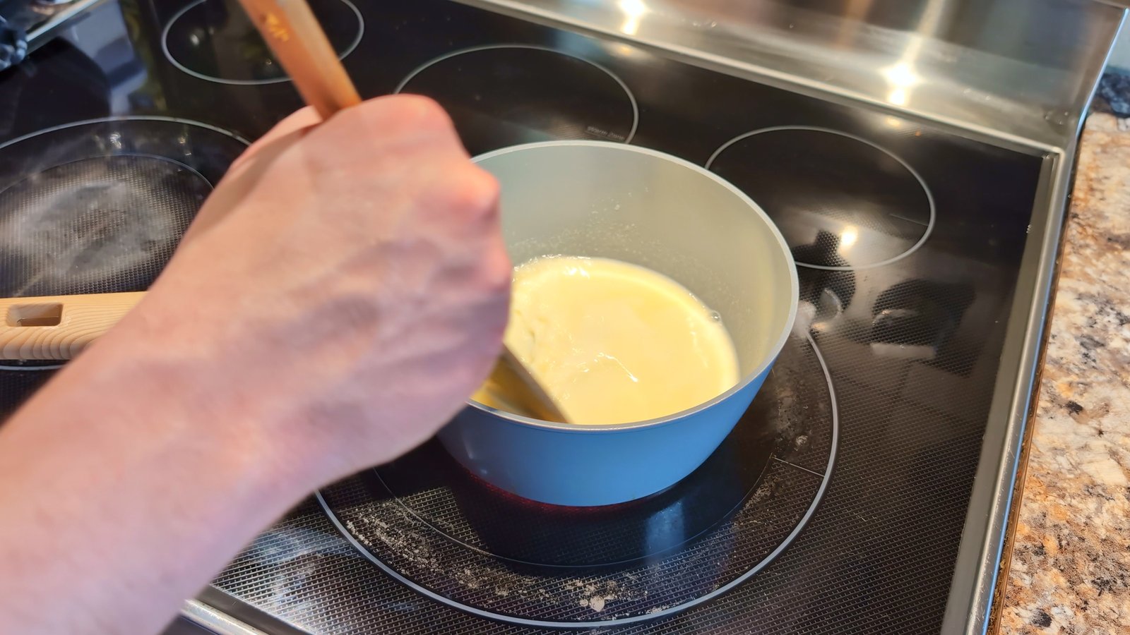 - In a saucepan, combine the 100 g unsalted butter, 125 ml milk and 125 ml water over medium heat.