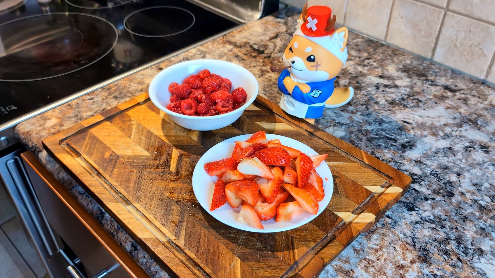 - Clean and quarter the 150 g strawberries and wash the 150 g raspberries.