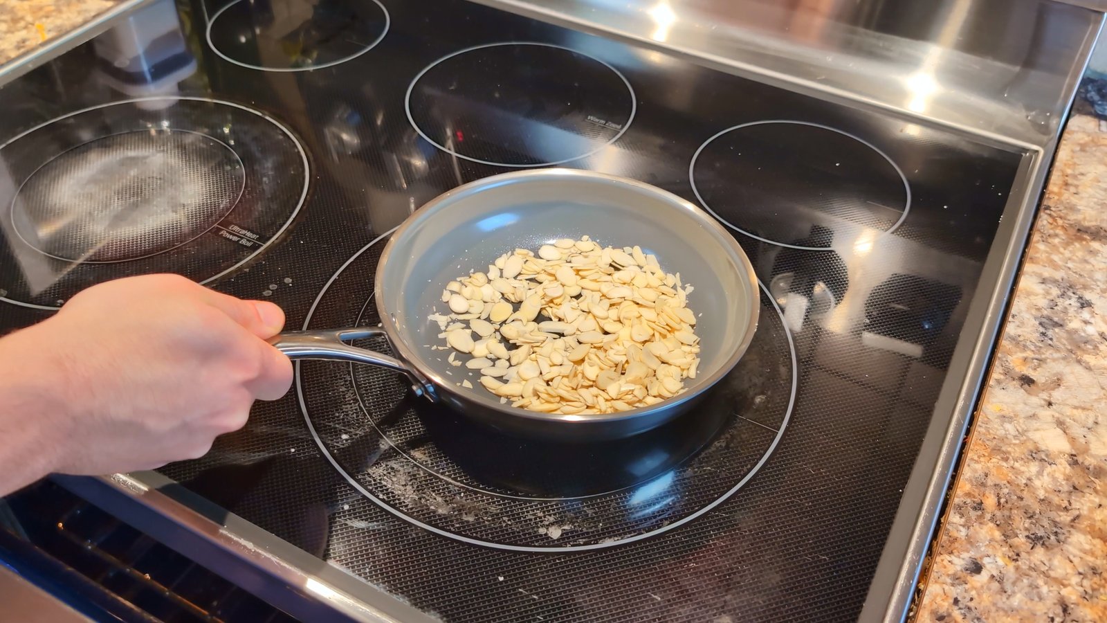 - Heat a dry skillet over medium-low without any oil, add the 20 g almond slices in a single layer, and stir constantly for 2–5 minutes. As soon as they turn golden and smell like toasted popcorn, remove them immediately to a cold plate so the residual heat doesn't burn them.